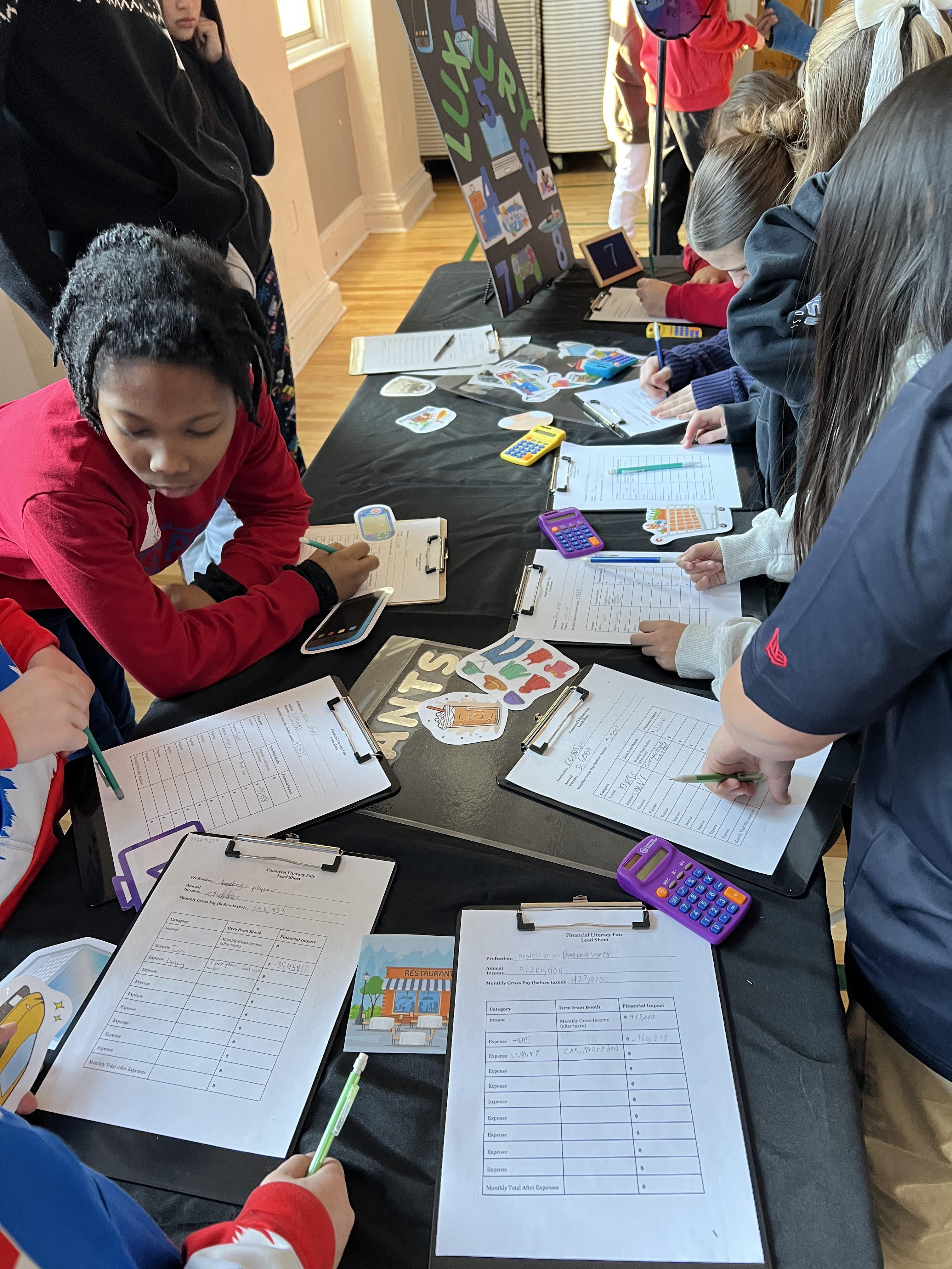 The following day, students participated in a Financial Literacy Fair presented by PricewaterhouseCoopers, where students picked a career to determine their salary. PwC staff members transformed the gym into an interactive learning space, setting up stations that simulated real-life financial decisions. Students used their salary to rotate through tables tracking monthly expenses, taxes, and other costs, ultimately seeing how much money they would have left at the end of each month. The experience was both educational and thought-provoking. Eighth grader Delia reflected, “The Financial Literacy Fair was a great experience. I didn’t realize how much everything really costs, and I learned that you have to budget for all of those things. We even learned the cost of things like housing and taxes.”